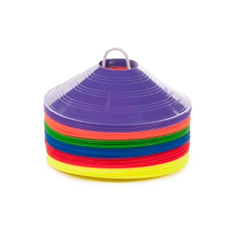 Six cones in each of the following colours; purple, orange, green, blue, red and yellow. Cone stand included for easy storage and transport.